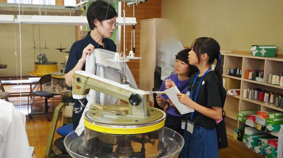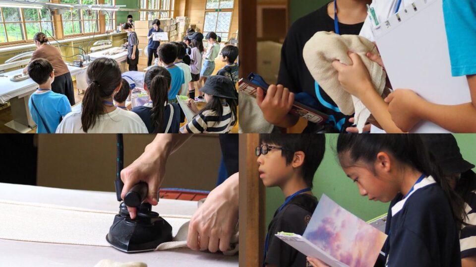 ふだんは見ることのできない作業の様子を見学するだけでなく、工程ごとにカシミヤのやわらかさを1人1人が実際に手で触ることができましたが、アイロンの蒸気をあててカシミヤの生地がさらに軽くやわらかくなっていると実感できて、子どもたちもびっくり。加えて、カシミヤは着るほどにやわらかくなり、肌触りも良くなっていく(「経年変化」という言葉も教えていただきました)そうで、「長い年月をかけて着る人になじみ、一緒に長く楽しめるのがカシミヤ」と説明を受けて、子どもたちはさらに驚いていました。