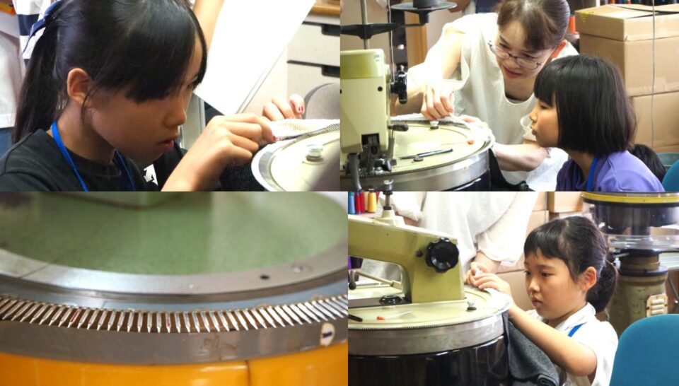 さまざまな工程を見学したなかで、子どもたちが実際に作業を体験したのが「リンキング」です。人の目と手で細かな生地の編み目ひとつひとつをつなぎ合わせて、ニットに仕立てあげていく「リンキング」は熟練した職人が担当する作業だそう。