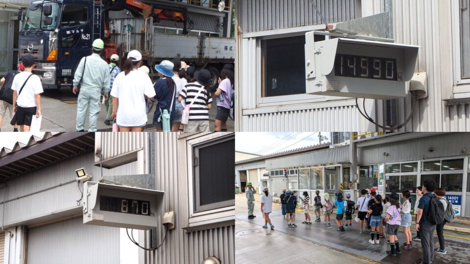 工場見学で最初に体験したのが、トラックの重量がその場で確認できる装置です。工場の出入り口に埋め込まれた鉄板の上にトラックを停止させるとトラックの重量が計測できるというもので、過積載(法令で定められた最大積載量を超えて荷物を積んで走行すること)の防止にも役立つそう。この装置に子ども17人+大人4人で乗り、トラックとの重さを比較しました。もちろんトラックの重さには遠く及びませんでしたが、ふだんはできない体験を子どもたちも楽しんでいました。