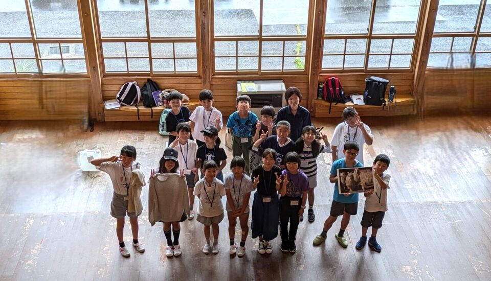 工場見学の最後は、旧黒岩小学校で多目的ホールとして使用されていた場所で記念撮影。廃校となった小学校を再利用した工場で、手仕事のすばらしさを体験できた学びの多い見学となりました。