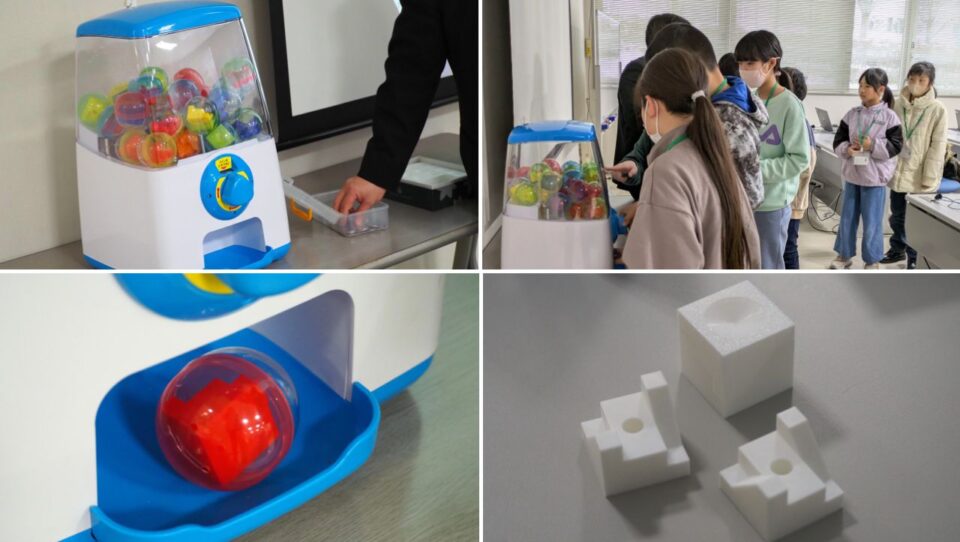 休憩をはさみ、90分ほどで製品の3Dデータは完成しましたが、子どもたちはまだ何ができたかピンと来ていない様子。本来ならこの後、子どもたちが3D CADでつくったデータ(設計図)をもとに3Dプリンタで造形していきます。しかし今回は時間がないため、事前に3Dプリンタで造形した完成品が登場。しかも、カプセルトイに入って目の前に現れたため、子どもたちも大喜びでした。