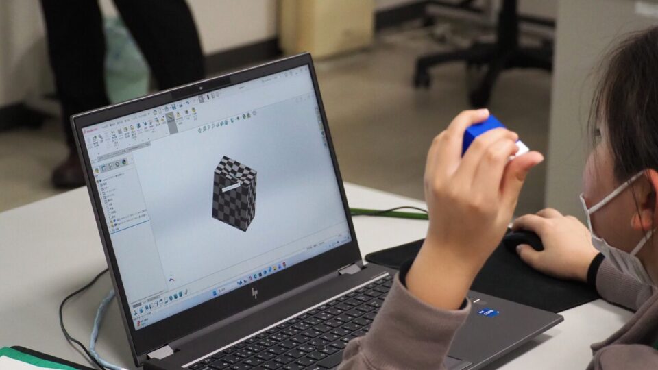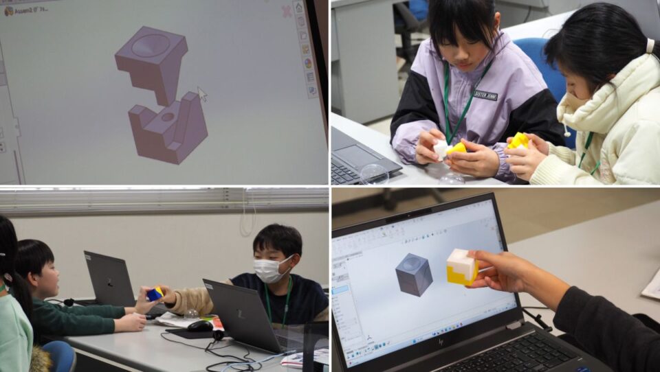 子どもたちがワクワクしながらカプセルトイから取り出した完成品は不思議な形状をしており、その2つを合体させると、正方形のボックスになる仕掛けになっていると知ってびっくり! 子どもたちは友達の完成品と合体させて遊んだりしていました。2つの完成品があまりにもキレイにハマって正方形のボックスになるため、「ピタッと合って気持ちいい」といった声も聞かれましたが、3D CADではパソコンの画面上で2つの完成品を合体させると正方形のボックスになる様子を事前にシミュレーションできると知って、その便利さにさらに驚いていました。
