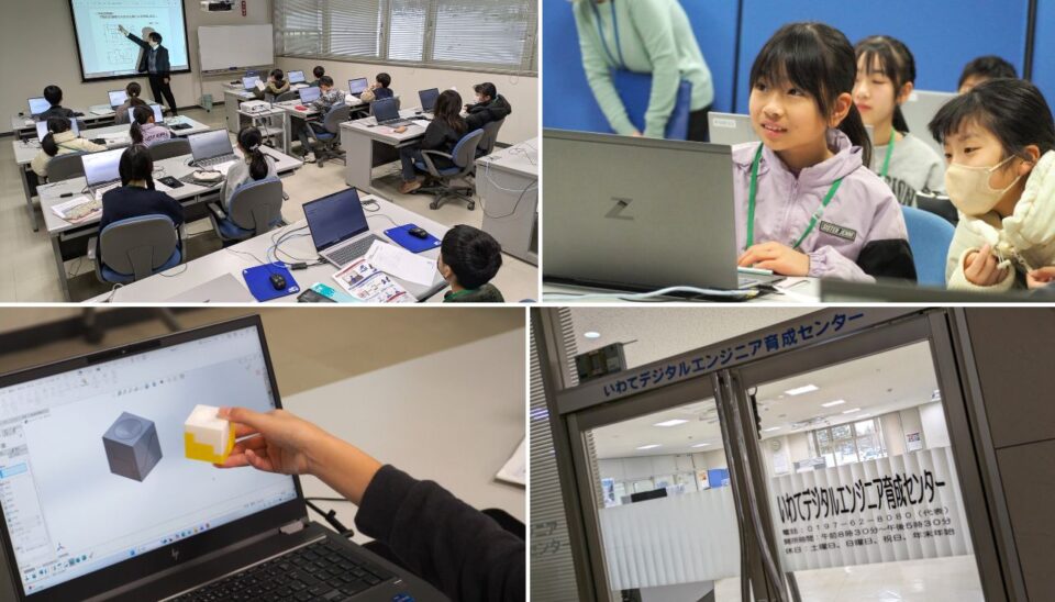 今回はIwate-DEの小原照記センター長の指導のもと、3D CADを使ったものづくりを体験しました。1人1台用意されたパソコンを前にして、何がはじまるのかワクワクしている子どもたちに、まずは3D CADについての簡単な説明が行われました。