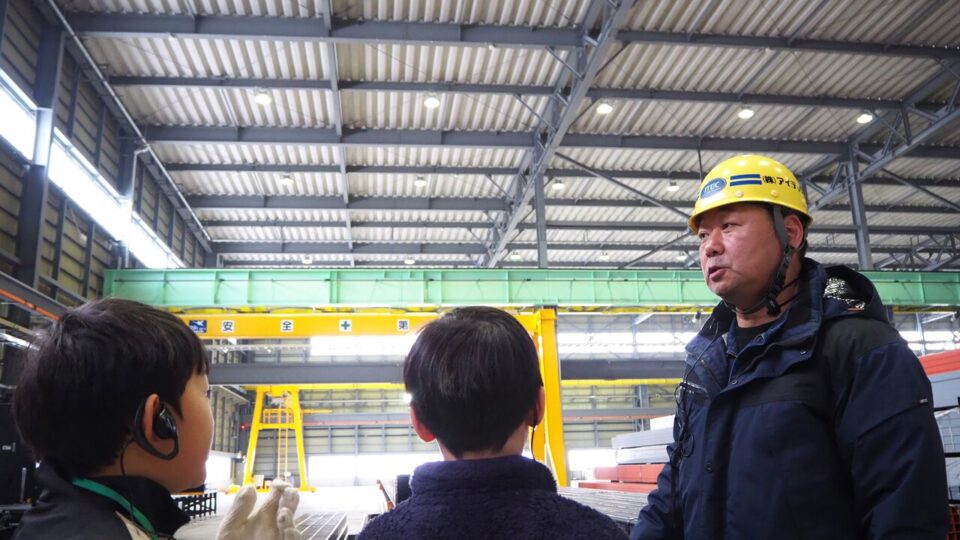実際に工場内に足を踏み入れると、縦250m×横135mの広大な敷地にもかかわらず、人陰はほとんど見当たりません。北上D・M・Cが扱う鋼材は月間4,000トンだそうですが、それをわずか24名でまかなっていると知り、子どもたちも働くヒトの少なさにびっくりしていました。