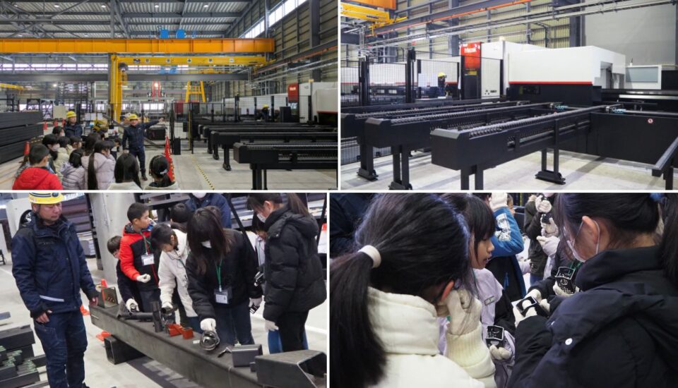 同社の強みは鋼材を供給するだけでなく、お客さまの多様なニーズに合わせて穴あけ・切断・曲げといった加工に柔軟に対応できる点だそう。工場見学では、その様子を見学できました。