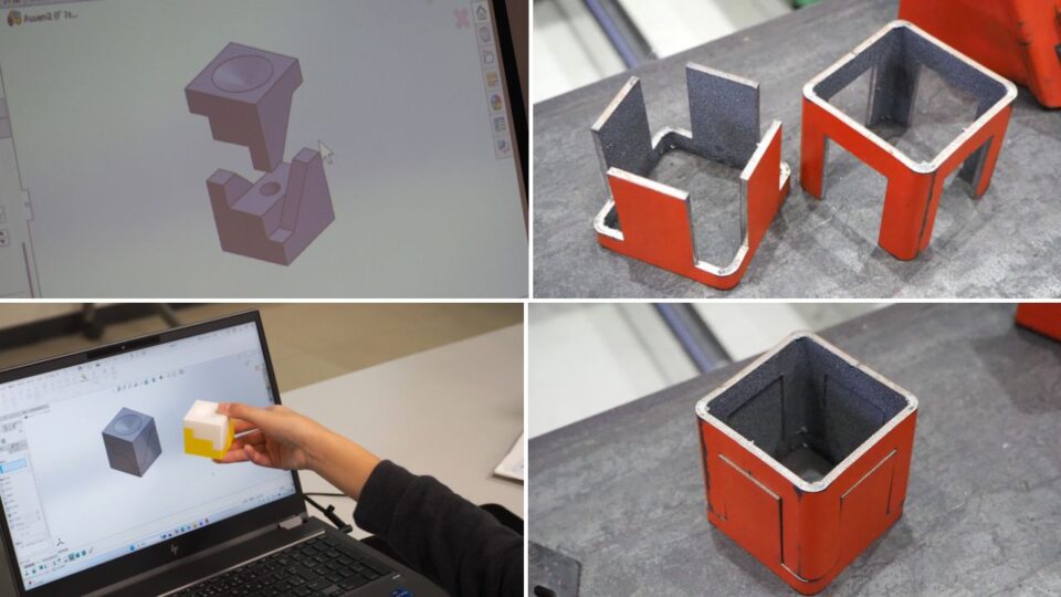 2つの製品を合体させると正方形のボックスになる仕掛けを目の当たりにして、「実用性はないけど面白い!」と言った子どももいました。この製品は手軽に3D CADの魅力を知ってもらうために小原センター長が考案したオリジナル製品のため、確かに世の中には他になく、実用性はありません。しかし、子どもたちは午後の工場見学で、同じ仕掛けでつくった製品が実際に活躍している様子を目の当たりにすることに……。午後の工場見学も、乞うご期待!